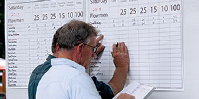 Plowing concludes and the judges proceed into the fields to score. Plowmen head to the point board by the Junior Fair building to await their scores. Bill and Craig tally the judges’ scores and post on the point board at the end or the plowing day. The left column indicates the day, class and name of the plowman. Columns along the top indicate land and point criteria leading to the total score for each plowman.